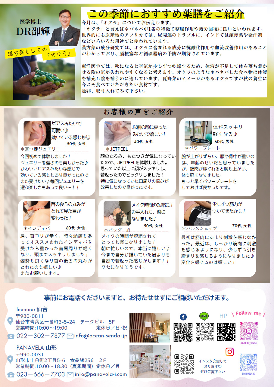 NEWS 健康寿命を延ばす事を一緒に考えてみませんか? トップ お知らせ イミューンニュース125号 Access 住 所/仙台市青葉区一番町3-5-24 テークビル5F 営業時間/10:00~20:00(19:30 受付終了) 定 休 日/日曜・祝日 電話番号/022-302-7877 ※当面の間、営業時間は19時までとなります。 ocean-sendai.Inc Immune SENDAI SINCE 2014.